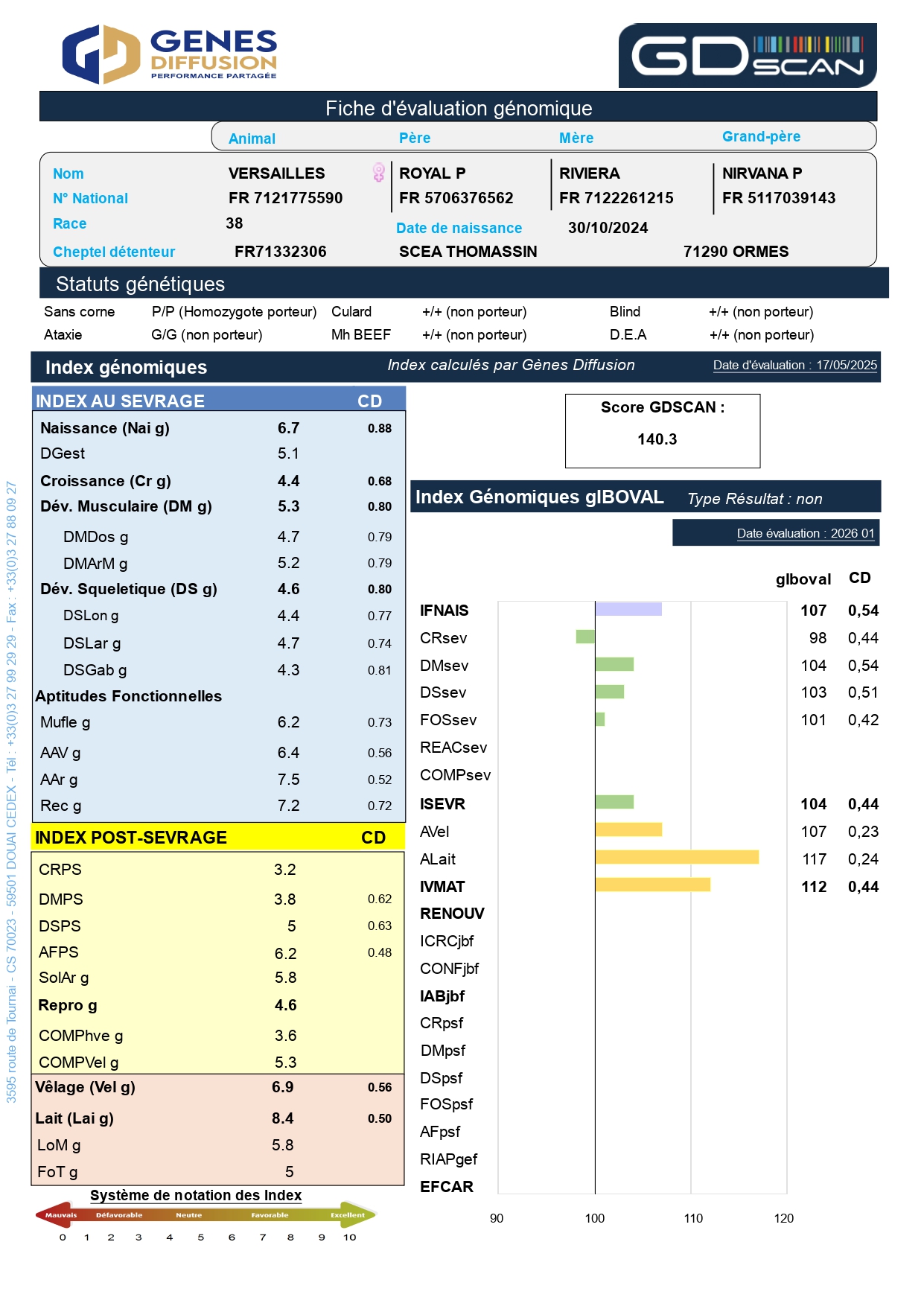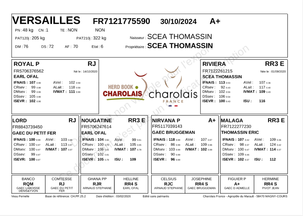 VERSAILLES n’a que 1an et quelques mois mais impose vraiment sa place avec son élégance. Elle est issue d’une prestigieuse lignée de chez Éric et Romain THOMASSIN à ORMES. MALAGA est sa grand-mère mais également celle de ULMO P, le taureau star du catalogue Gènes Diffusion 2025/2026. C’est une lignée où se cumul les hautes qualités laitières, le volume et le vêlage facile. VERSAILLES possède un très bon potentiel squelettique avec de très bonnes qualités de race et est homozygote sans corne.