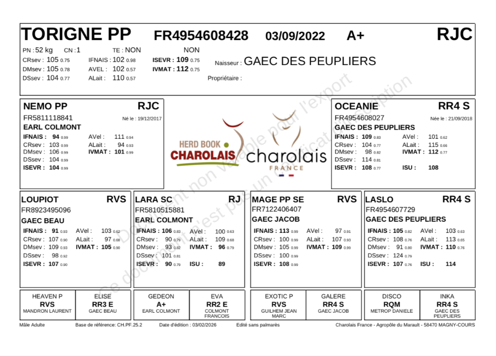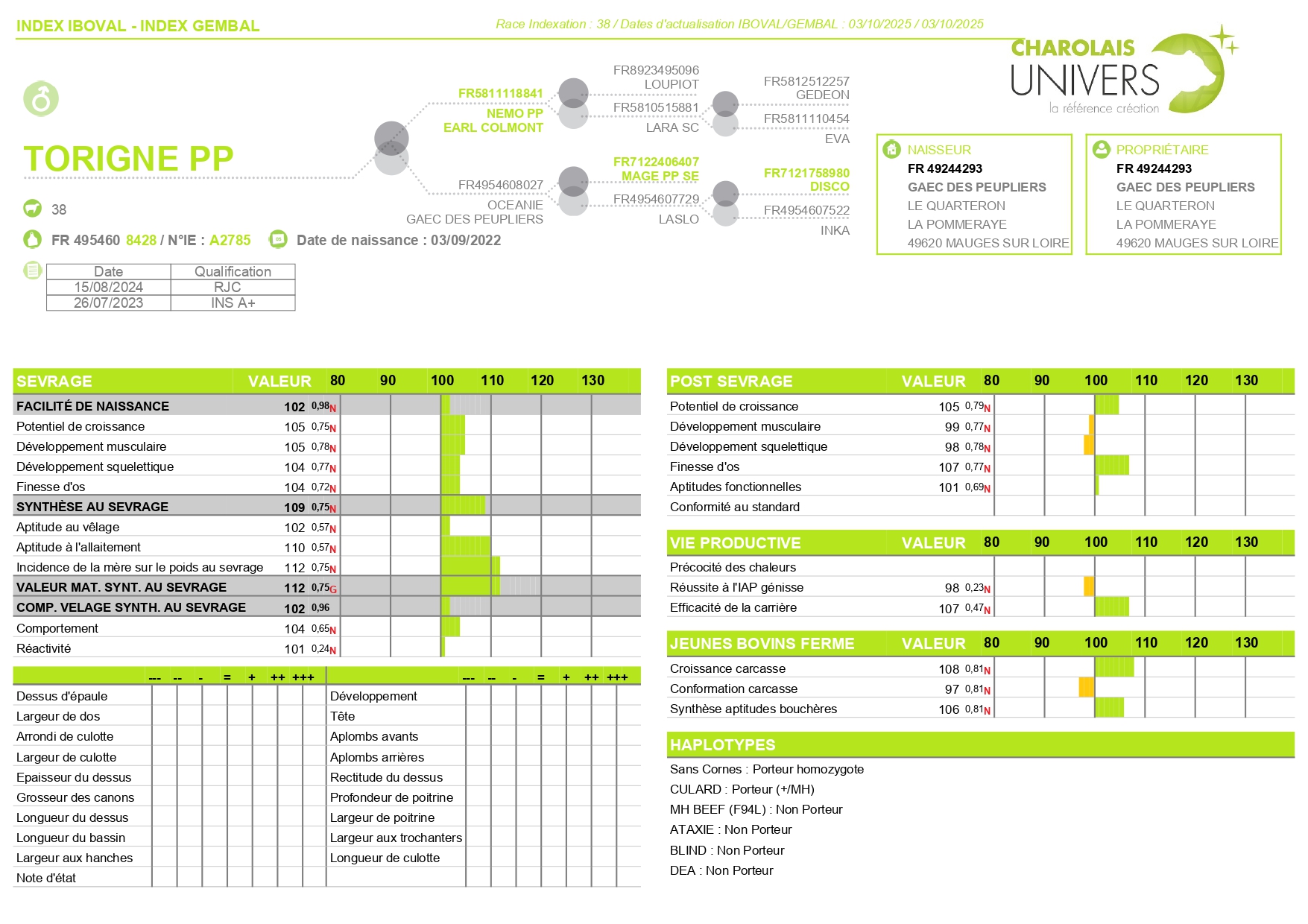 Nous l’avons couplé avec le taureau TORIGNE PP issu du schéma de Charolais Univers. Ces qualités de race, son potentiel en qualité maternelle, son profil plutôt mixte viande et le fait qu’il soit également homozygote sans corne, font de ce lot d’embryons une très grande valeur génétique, avec beaucoup de cumul en ALAIT et en AF, une morphologie qui se complète très bien et surtout l’assurance de faire naître 100% des veaux homozygote sans corne.