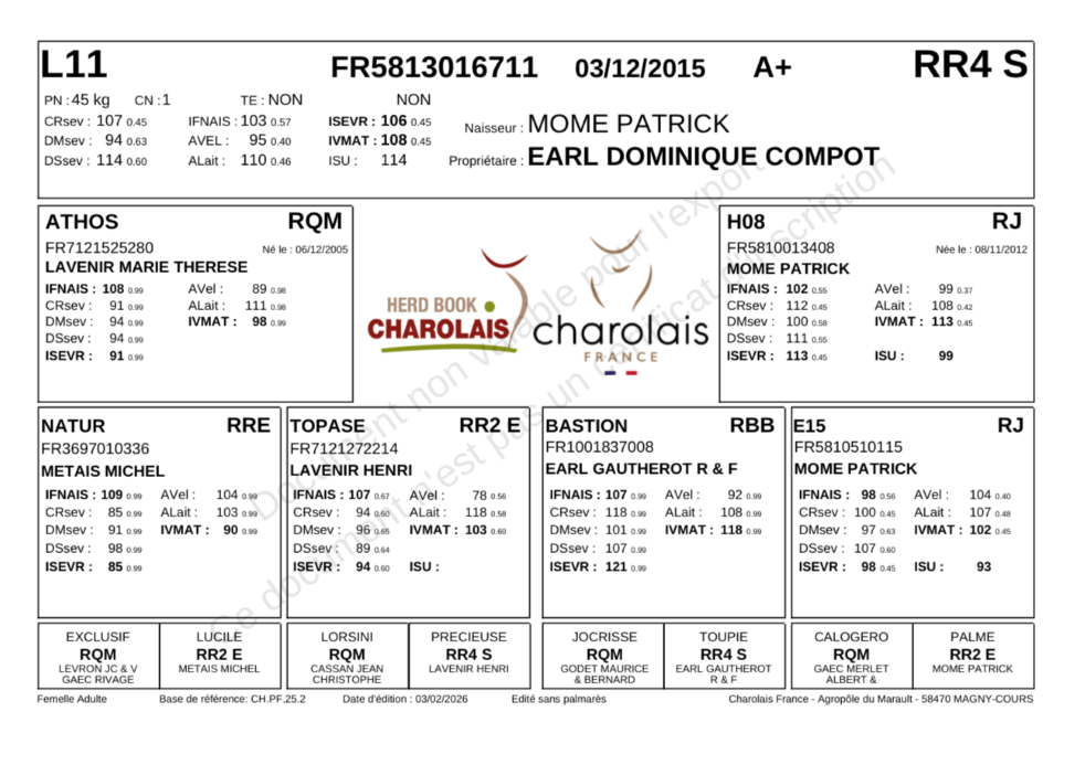 L11possède une lignée de plusieurs générations de parents issus de vêlage facile avec beaucoup de qualités maternelles : ATHOS / BASTION / CALOGERO. Ces qualités de race et sa morphologie tapent à l'œil dès qu'on l’aperçoit. Sa production est à son image avec 3 filles toujours en production et tous ces mâles vendus reproducteurs. Sa morphologie (arrière-main, rectitude du dos, profondeur de côte, race et gabarit), ses index, sa rusticité et sa production fond d'elle une vache exceptionnelle et très complète