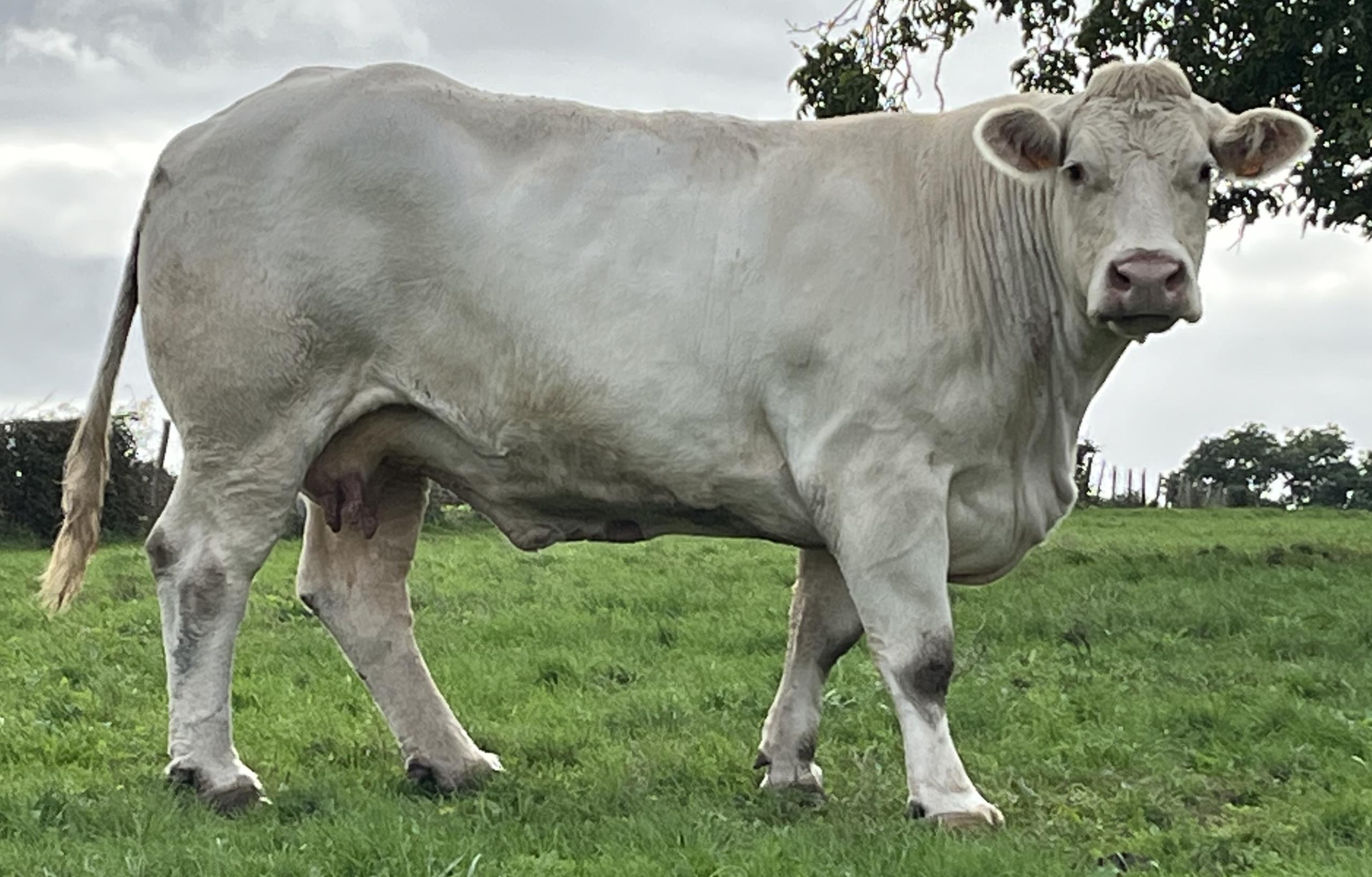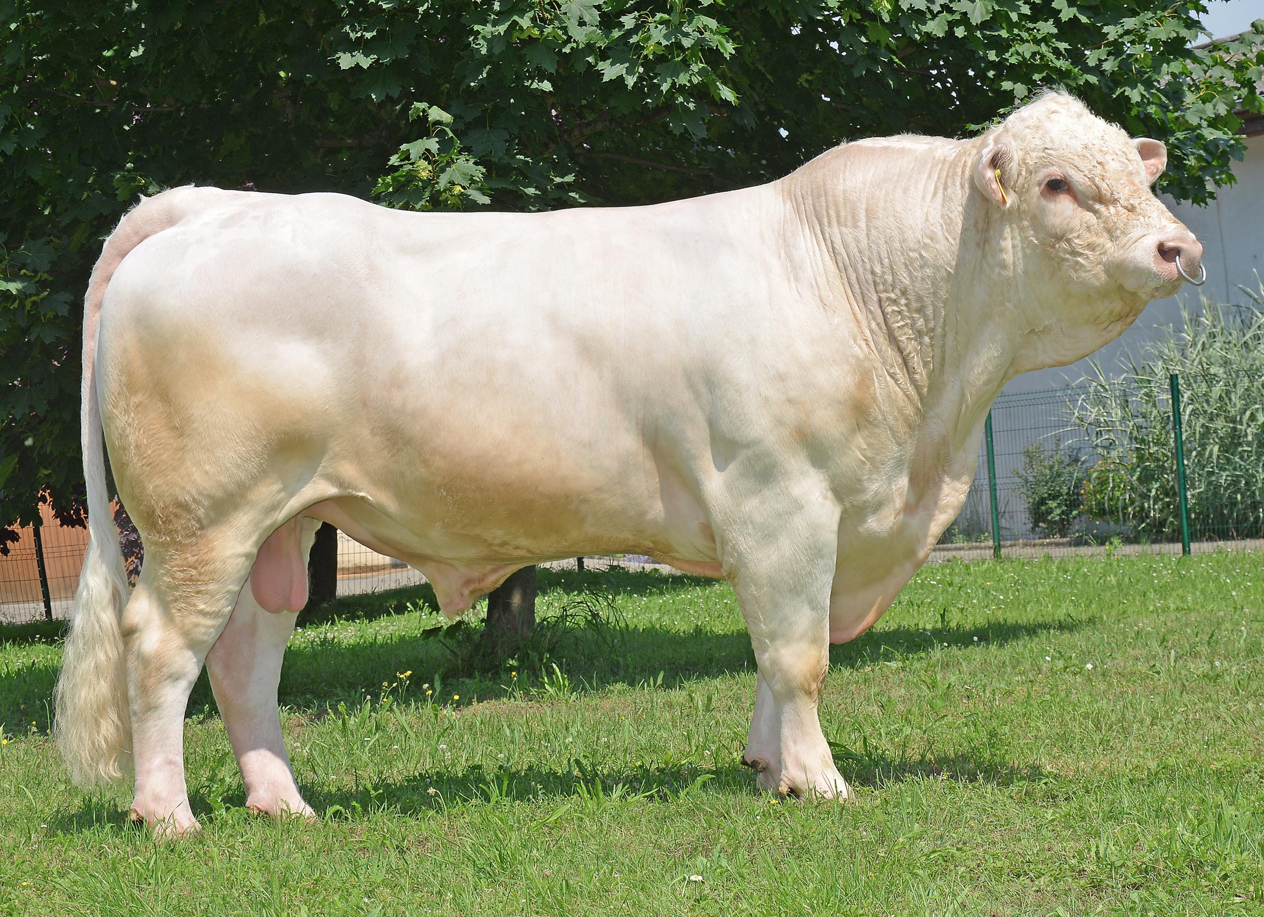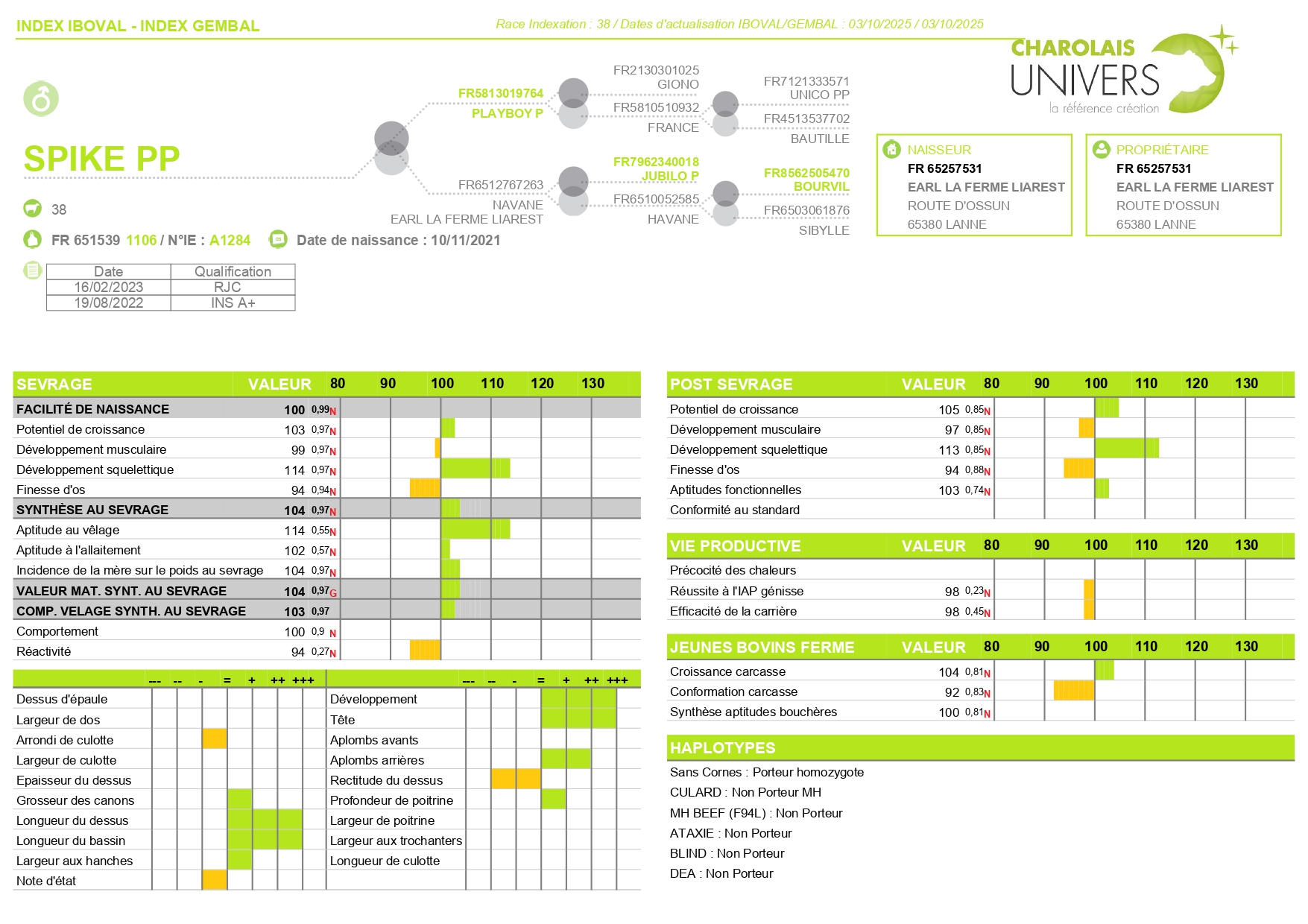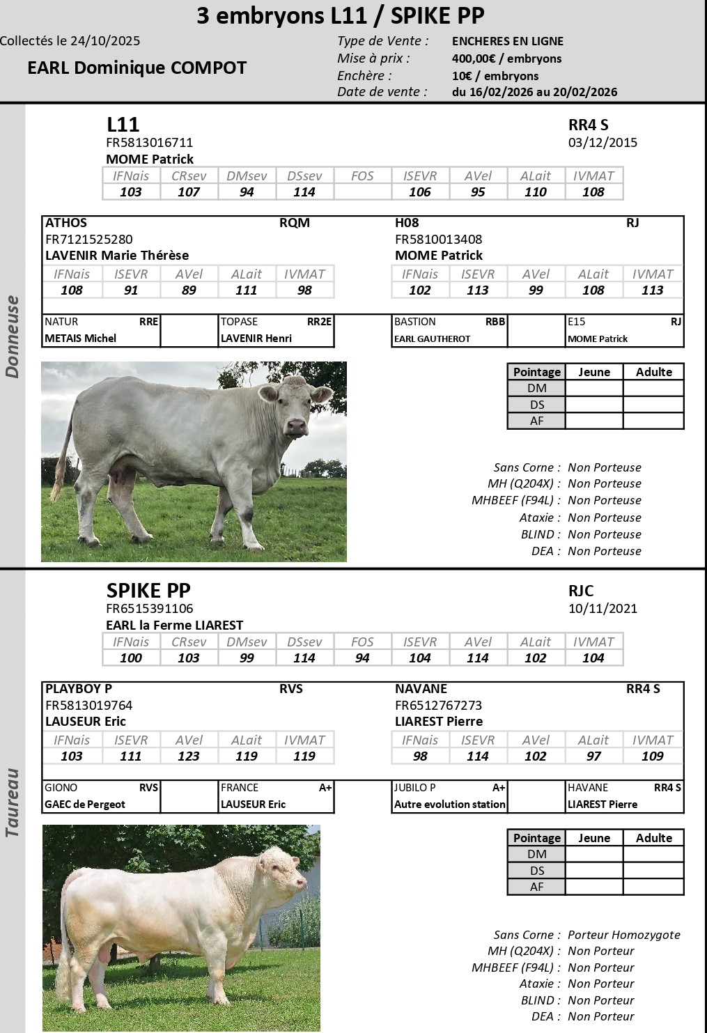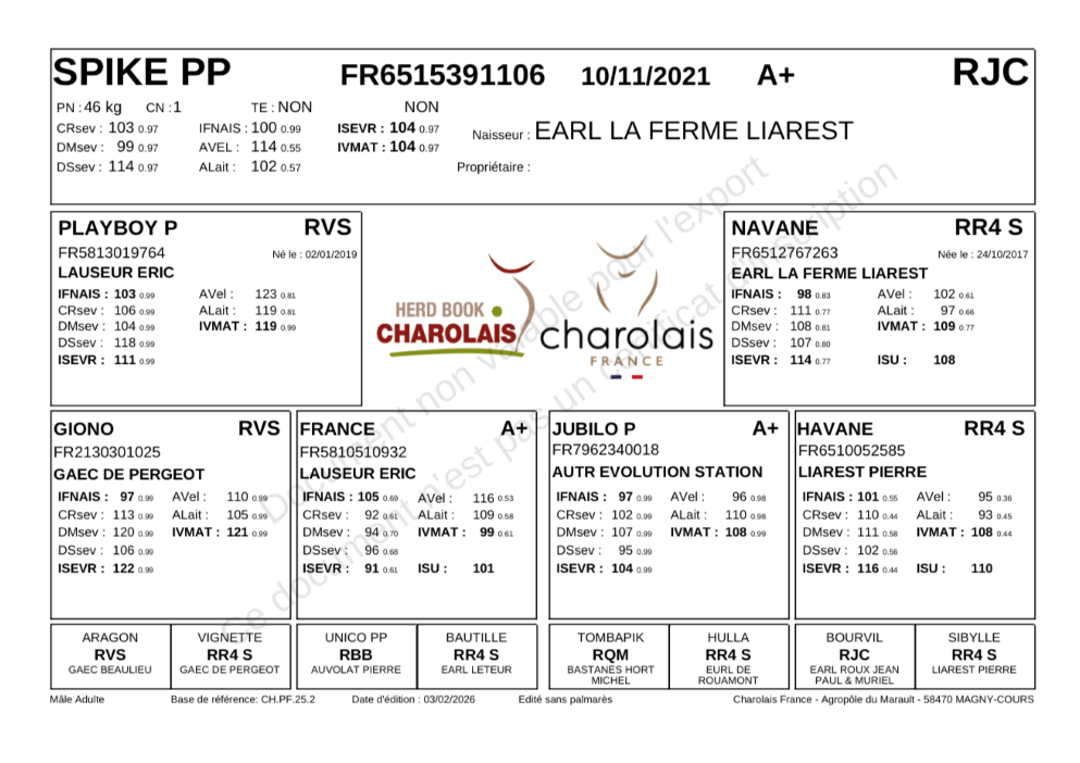 Nous avons décidé de l'accoupler avec SPIKE PP. Ce taureau sélectionné et diffusé par CHAROLAIS UNIVERS ; est homozygote sans corne. Nous avons fait ce choix, car nous sommes conquis par ses produits vus en ferme. En plus de donner 100% de ses produits sans corne, ses descendants sont très bien racés, très grossissant avec des aplombs solides. SPIKE PP est un fils de PLAYBOY P sur une mère JUBILO P. C'est un montage qui laisse un taureau avec du cumul sur de très bonnes qualités maternelles, beaucoup de race et du volume. Son fort index en AVel permet de corriger celui de L11 malgré son bassin irréprochable et ses nombreux vêlages sans assistance.