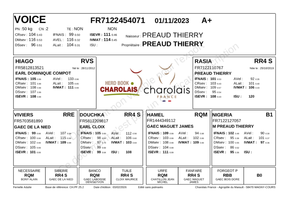 VOICE apportera la finesse d’os, le grain de viande et les qualités bouchères et maternelle. Elle est dotée d’un très belle largeur bassin, une arrière-main très bien dessinée, de la taille et un aloyau très prononcé.