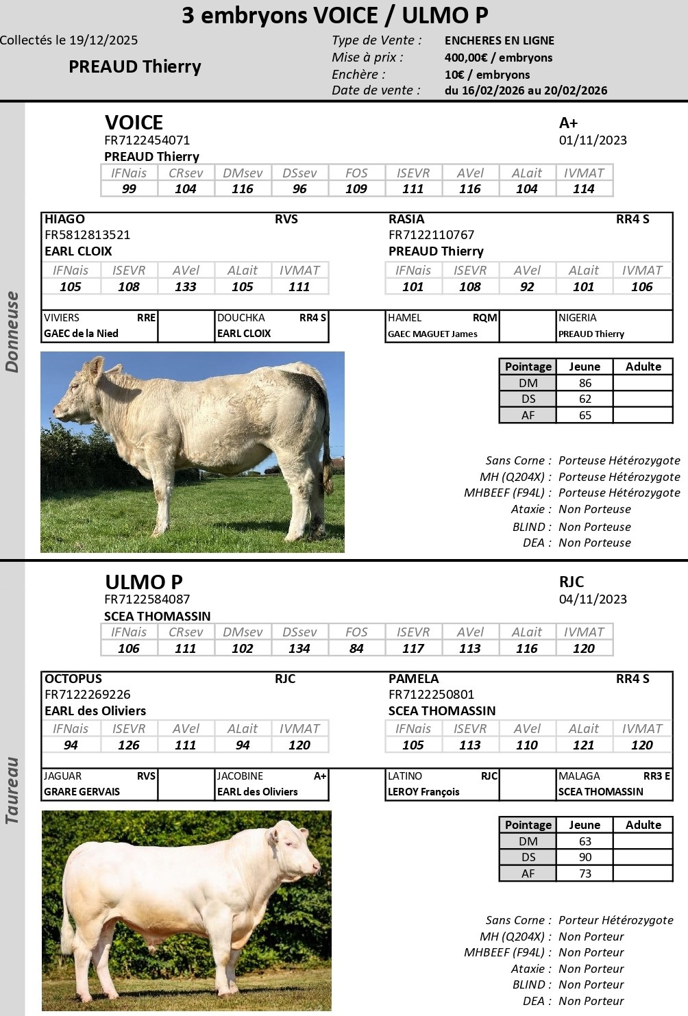 Cette association de VOICE avec ULMO P devrait vous laisser des produits très complet avec du gabarit, de la viande, des qualités maternelles, et avec un peu de chance, vous avez une chance sur 4 de faire naître un homozygote sans corne avec les souches sans corne éloignées dans le pédigrée autant du côté maternel que paternel.