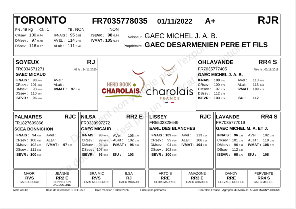 Nous avons choisi de l’accoupler avec le taureau TORONTO né au GAEC MICHEL J. A. B. en HAUTE SAÔNE. Ce taureau est diffusé par FEDER à ses adhérents de la section repro. Il a été acquis lors de la vente aux enchères de CREANCEY et avait même été le Top Price de son cru. Son père SOYEUX est né dans le très célèbre élevage du GAEC MICAUD comprenant des souches de divers maisons de renommée tel que l’EARL MERCERON avec IBRA MIC (Prix du Championnat mâles de PARIS en 2018 et rappel en 2019), ou encore le GAEC GOUJAT avec MAORI (Super Prix de Fédération mâle adulte à MOULINS en 2019) appartenant à la SCEA BONNICHON. Sa mère possède des qualités maternelles dignes des grandes productrices. La morpho impressionnante de TORONTO avec ses qualités maternelles très élevées nous ont séduit pour créer des embryons cumulant tous ses critères entre lui et VALISE.