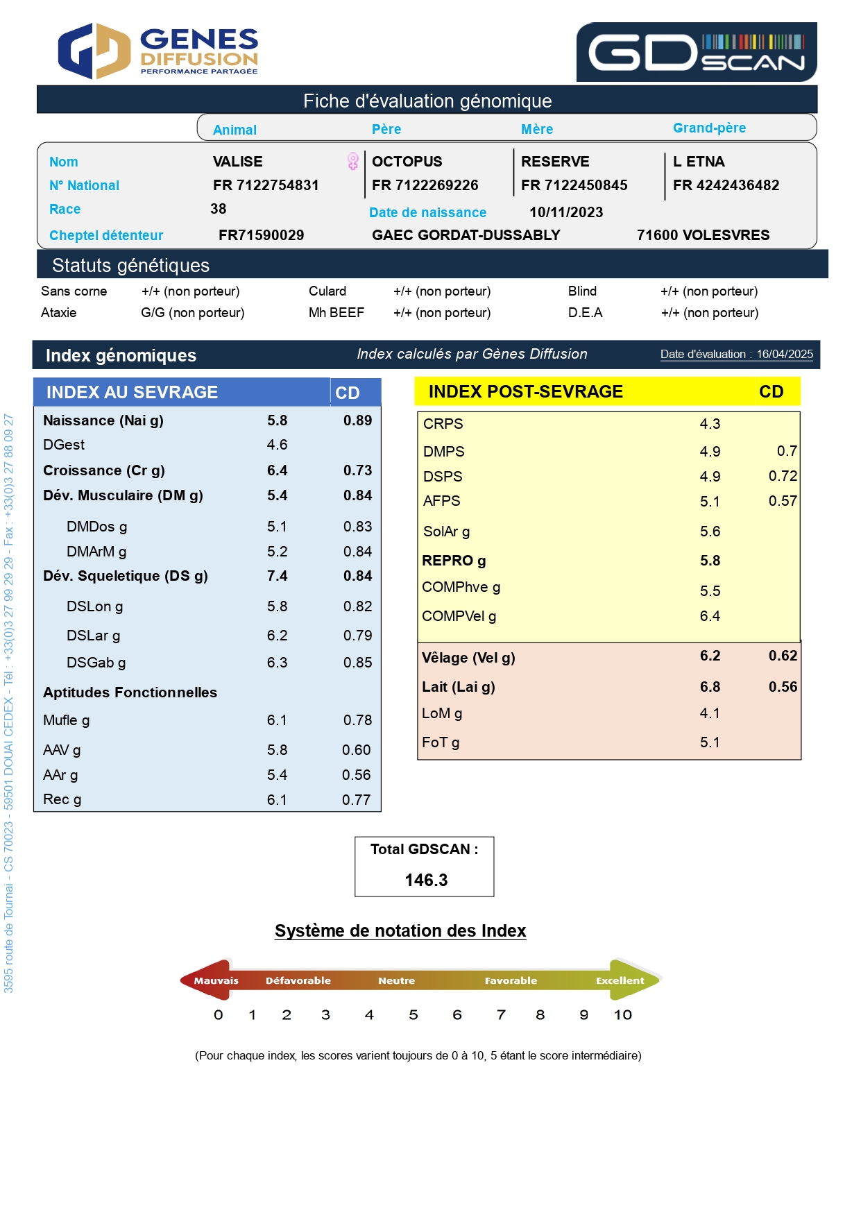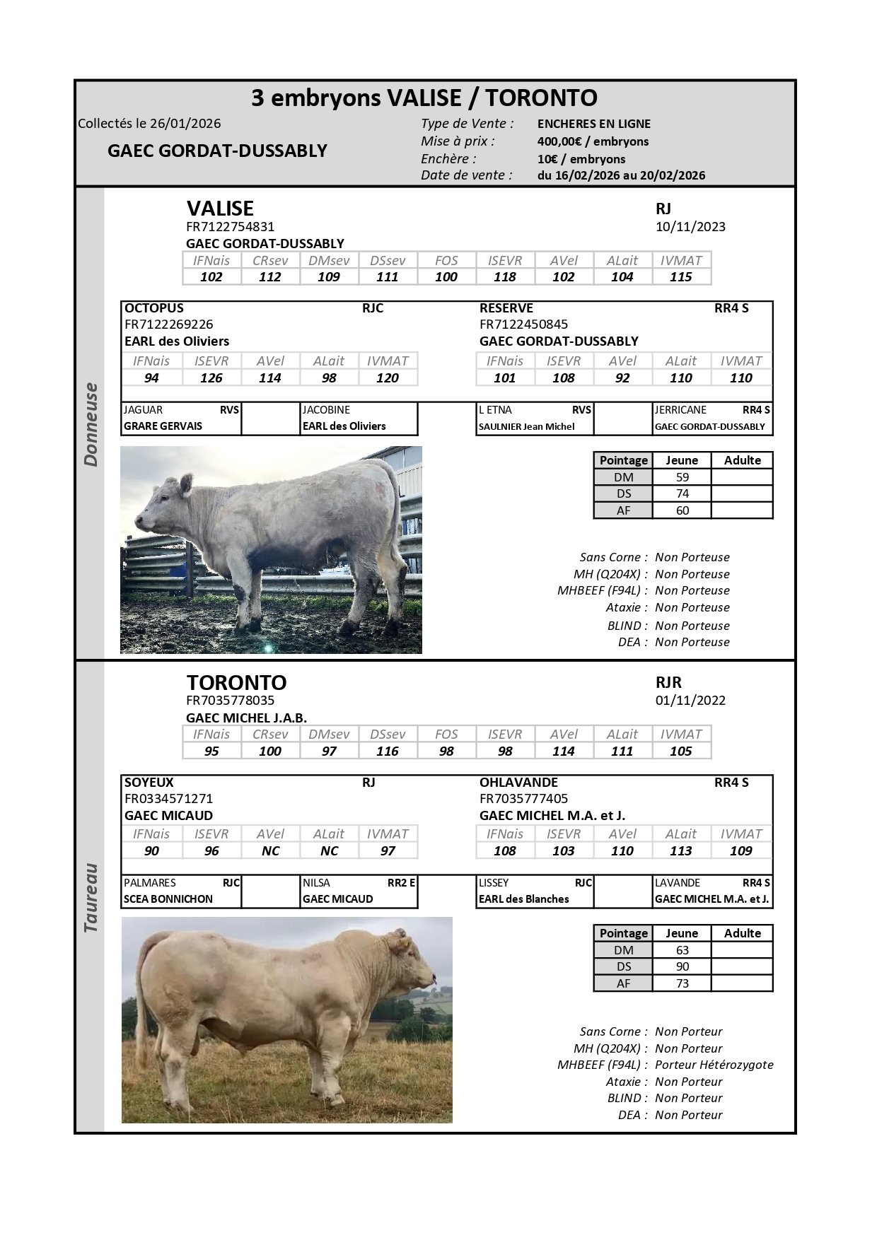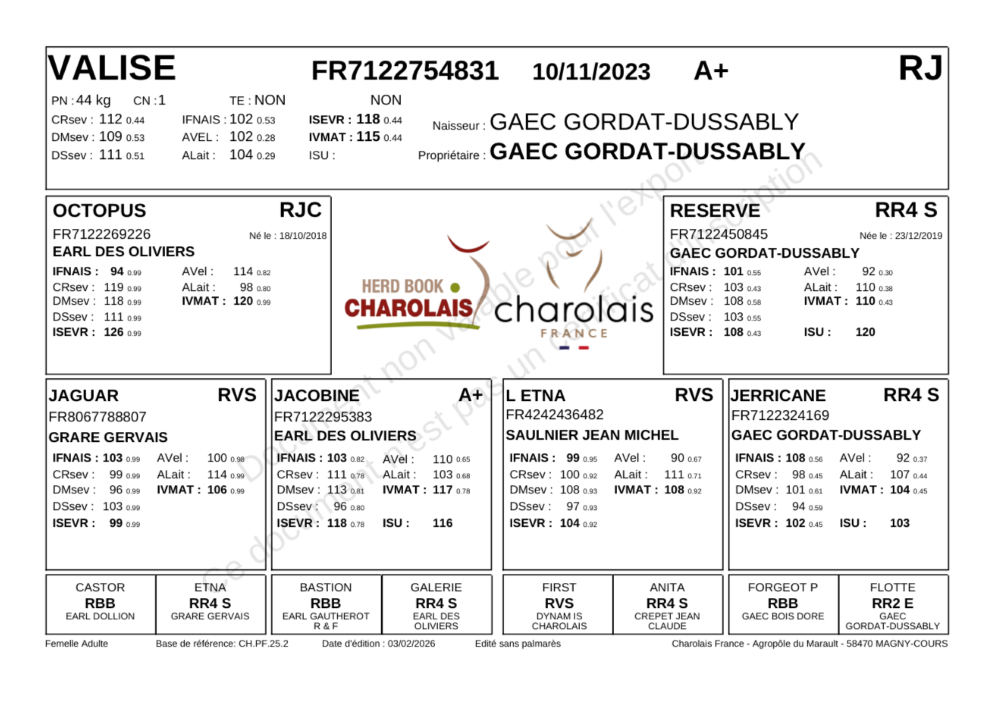 La donneuse de ce lot d’embryons est VALISE ; une génisse de 2ans née au GAEC GORDAT-DUSSABLY à VOLESVRES. Cette femelle est issue d’une lignée de plus de 3 générations de vaches qualifiées dont mère et grand-mère RR4 S. Sa mère RESERVE compte parmi les meilleures lignées de l’élevage à grosse morpho et qualités maternelles. A ses qualités raciales et de gabarit nous pouvons rajouter son caractère très calme. Son père OCTOPUS est un taureau acheté par GD en station UCC. Il avait terminé son évaluation en étant le top IMOCR de son année. C’est un taureau qui laisse une descendance avec beaucoup de morpho, très lourde, bien racée et solide dans les aplombs.