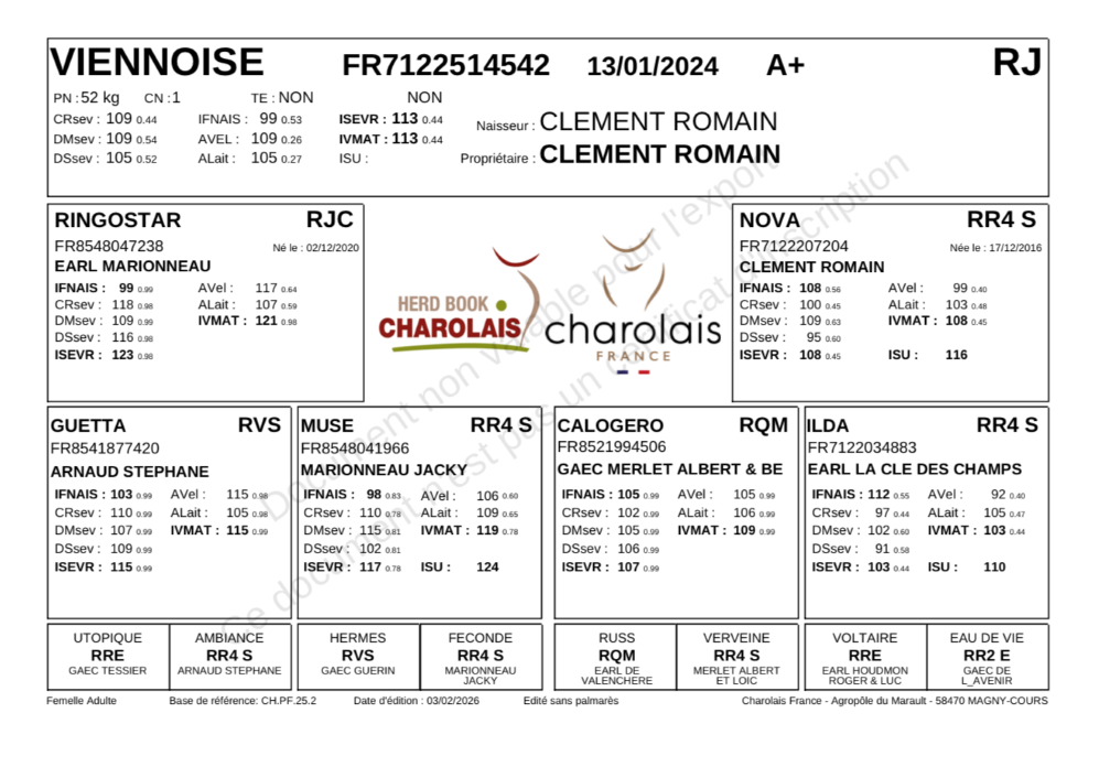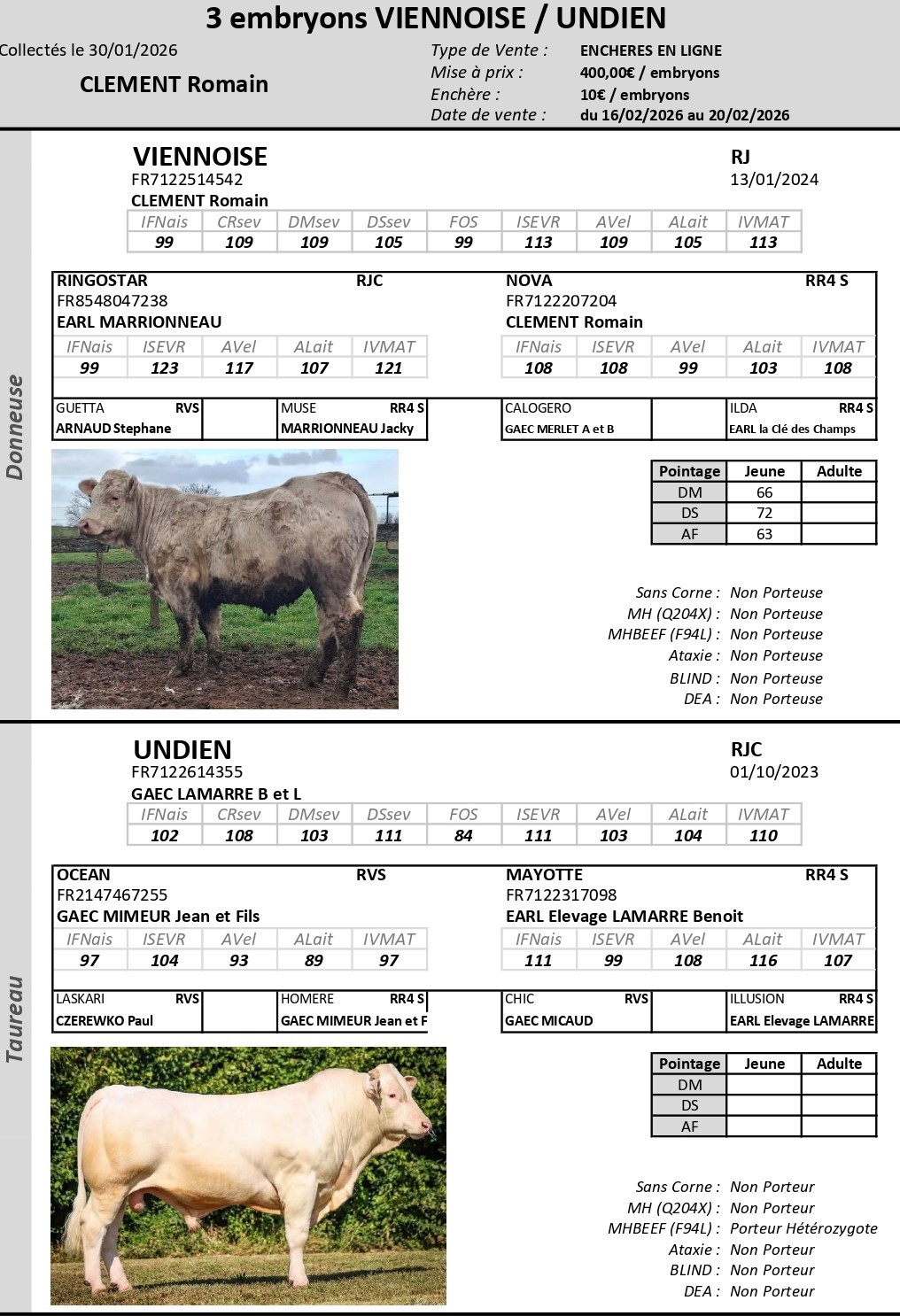 Notre dernier lot d’embryon mis en vente aux enchères est issu de l’élevage de Romain CLEMENT à LUGNY LES CHAROLLES. Sa génisse VIENNOISE à eu 2ans le 13/01 dernier et malgré son jeune âge, elle n’a rien à envier au gabarit des vaches de la cases à côté. Depuis petit veau, elle s’est toujours fait remarquer par l’avance qu’elle avait au niveau de sa morpho à comparer à ses consœurs de même âge. Il faut dire que ses parents n’y sont pas pour rien. Son père RINGOSTAR est un fils de GUETTA né à l’EARL MARRIONNEAU en VENDEE sur une mère au montage de souche de monte naturelle, avec HERMES comme père. Sa mère, était une fille du célèbre CALOGERO qui possédait énormément de qualités maternelles, beaucoup de qualités de race et un gros potentiel squelettique avec de la taille, des longueurs et de superbes largeurs. Sa production n’en est pas moindre, puisque tous ces produits font une carrière de reproducteur ou reproductrice. Et aux vues de la morpho que possède VIENNOISE et du potentiel de production de ses parents, nous ne prenons pas de risque en vous disant que sa descendance à de grande chance de se distinguer à leur tour dans leur futur élevage.