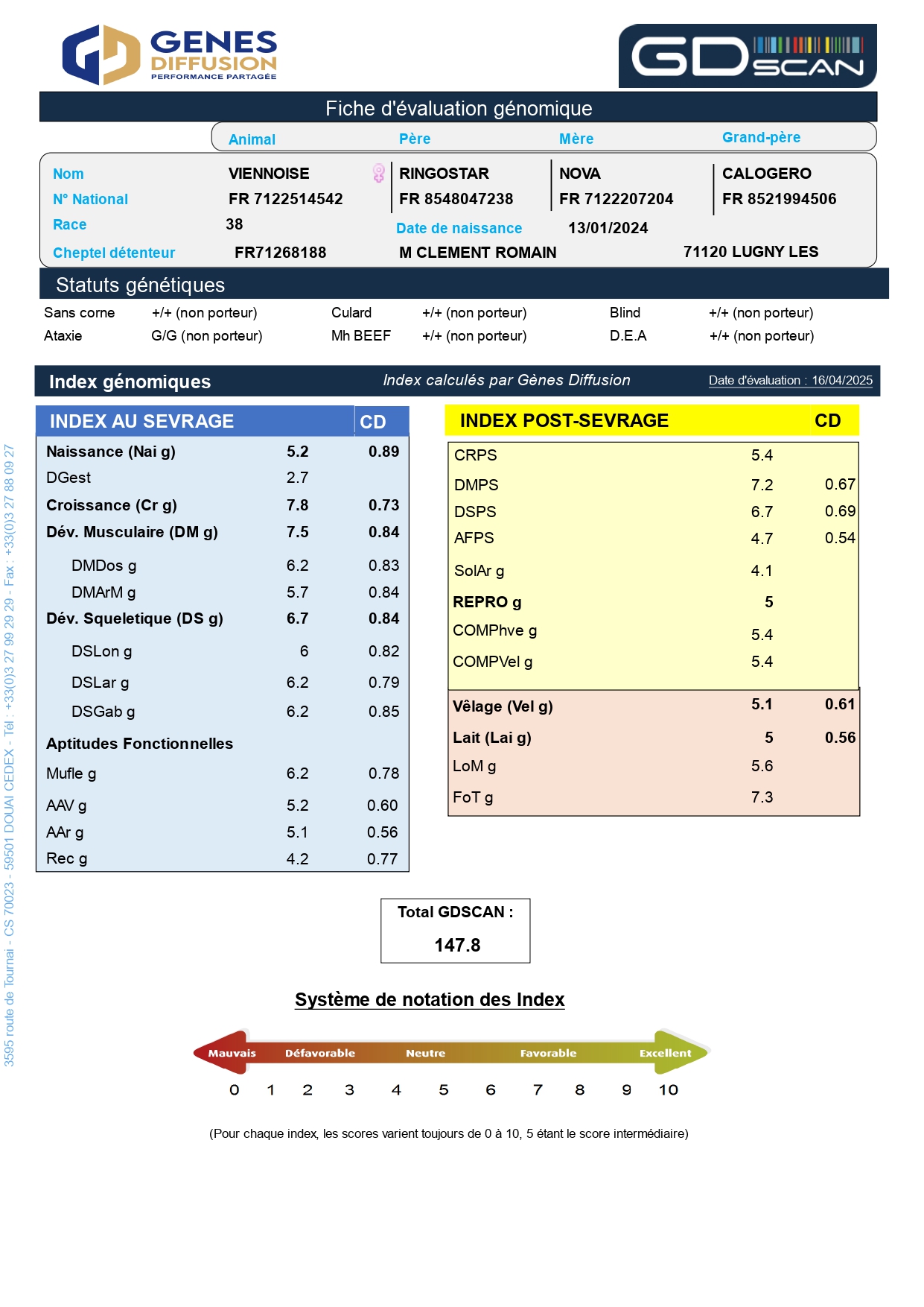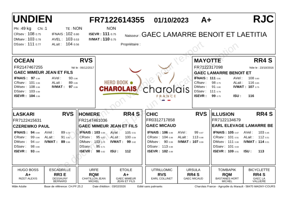 Et pour rajouter une couche de morpho et de gros gabarit, l’accouplement à été réalisé avec le taureau UNDIEN. Ce taureau fait parti de la promotion 2025/2026 de la sortie de catalogue Gènes Diffusion. Il est né au GAEC LAMARRE Benoît et Laetitia. UNDIEN est issu d’un accouplement entre une mère CHIC et le père OCEAN qui nous le rappelons, est encore aujourd’hui le record Top Price de toutes les ventes de la station de JALOGNY. UNDIEN est le fils de MAYOTTE. Cette vache a une production remarquable, puisque ses 2 filles ont été reproductrices chez Benoit et Laetitia et qu’au-delà d’UNDIEN acheté par GD, 2 de ses fils ont été vendu comme reproducteurs, que son 4ème veau mâle est en vente aux enchères de CREANCEY cette année et que ses jumeaux nés cet hiver sont déjà très prometteurs. MAYOTTE possède une production laitière impressionnante, avec beaucoup de gabarit, une très bonne race et une très belle finesse.