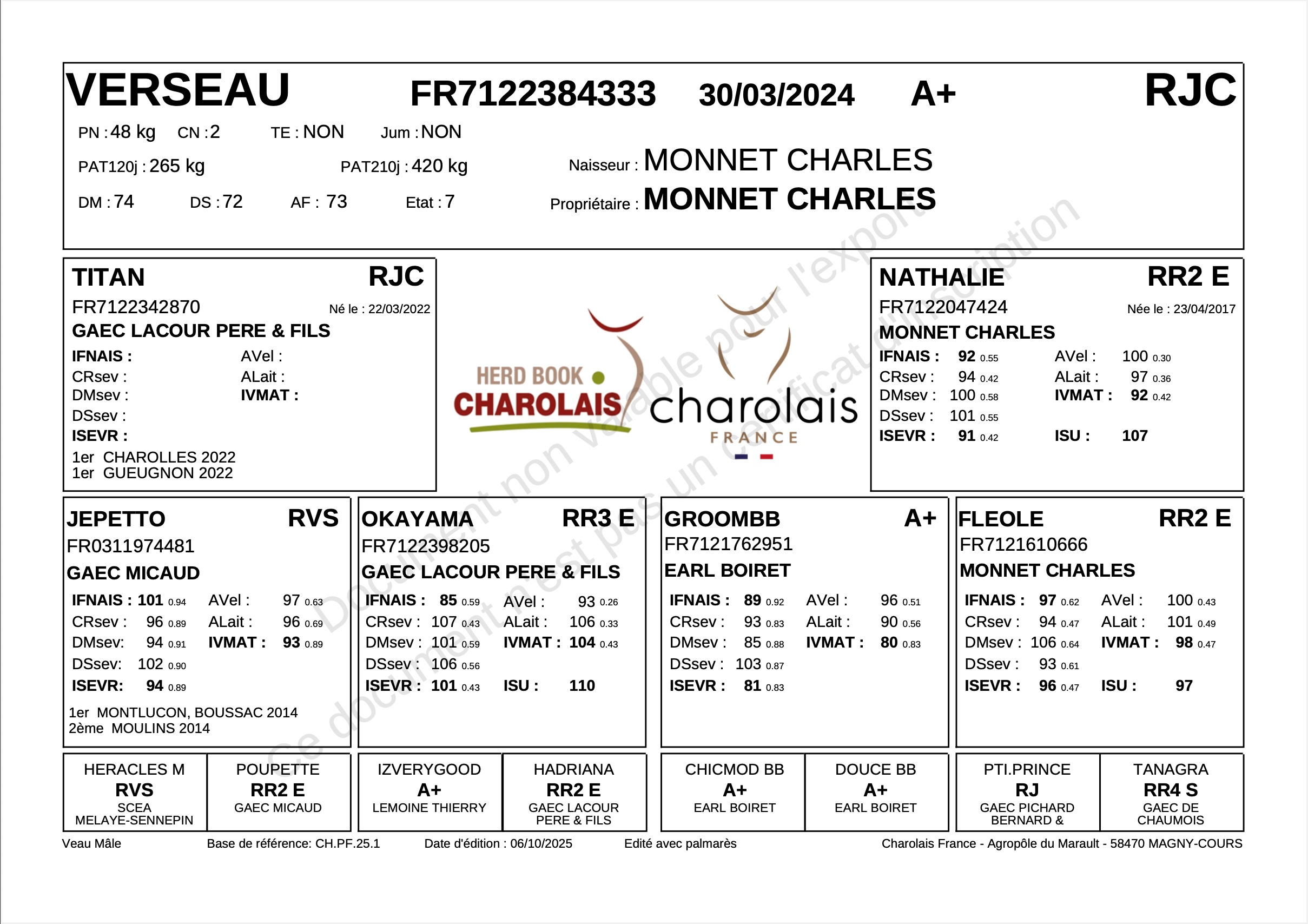 On retrouve Petit Prince dans sa lignée maternelle et Jepetto un taureau très puissant de chez LACOUR côté père. VERSEAU est un taureau très typé charolais