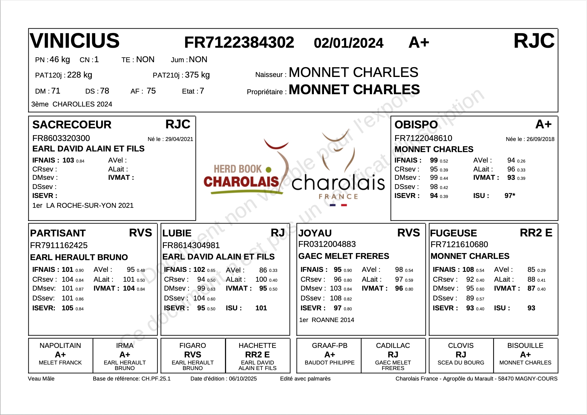 VINICIUS est un animal avec de nombreux points forts. Un volume, une longueur et un développement supérieur à la moyenne. Une arrière main très carrée, un bassin bien dessiné pour laisser des femelles et un très bon grain de viande. Des atouts que transmets bien son père SACRE COEUR. Une origine avec du développement, des qualités maternelles et de la facilité de naissance.
